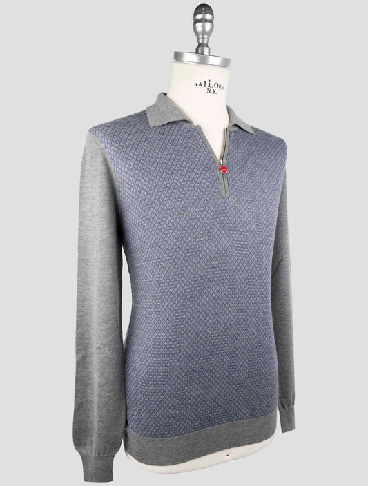 Kiton Geometric Cashmere Silk Polo Sweater Blue Gray Italian